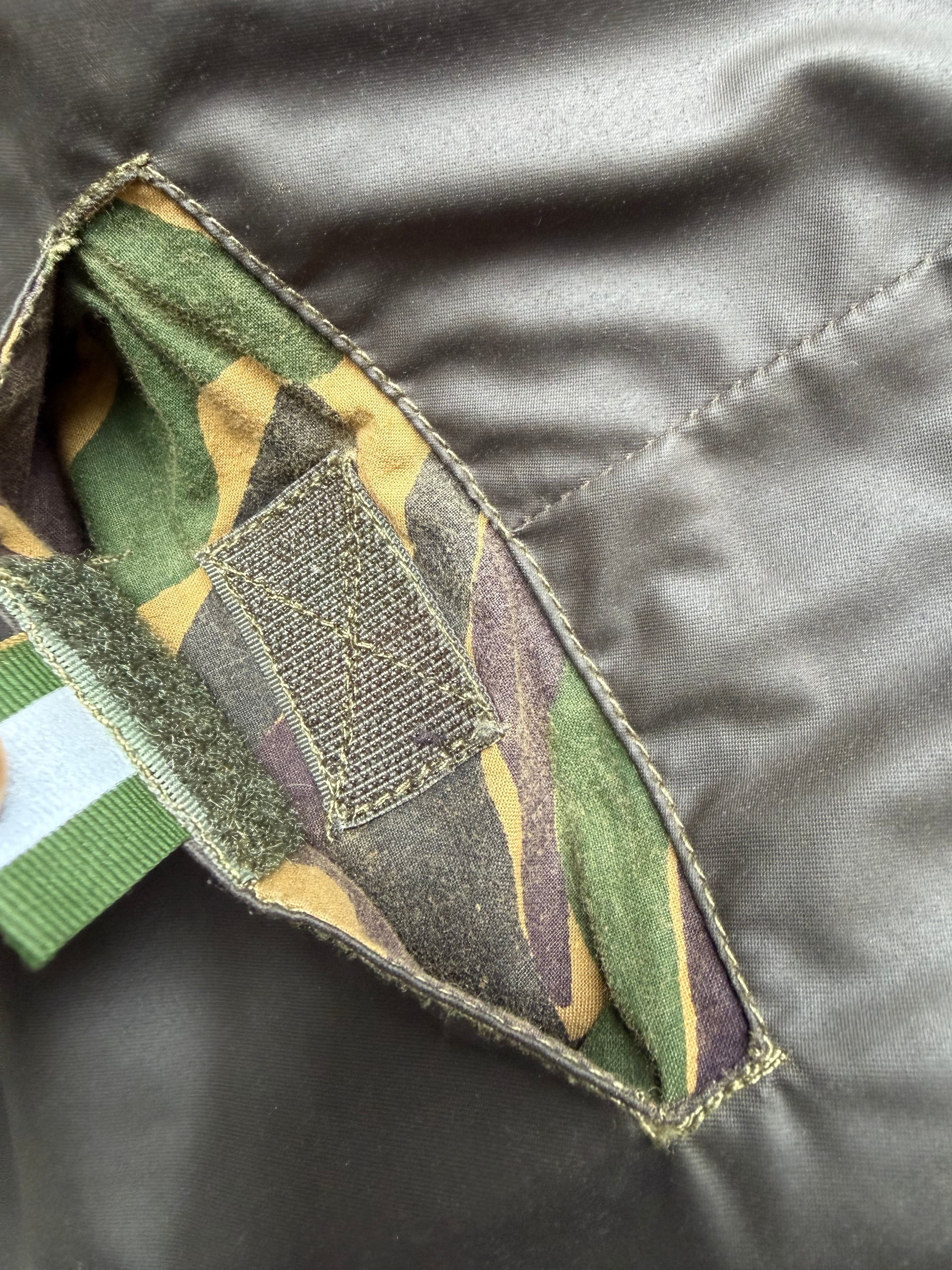 ウエストボタンの表地、裏地にコーティングの劣化、両太腿外側にも同様なコーティングの剥がれがあります。またフロントポケットのマジックテープのステッチとびがあります。画像参照下さい。