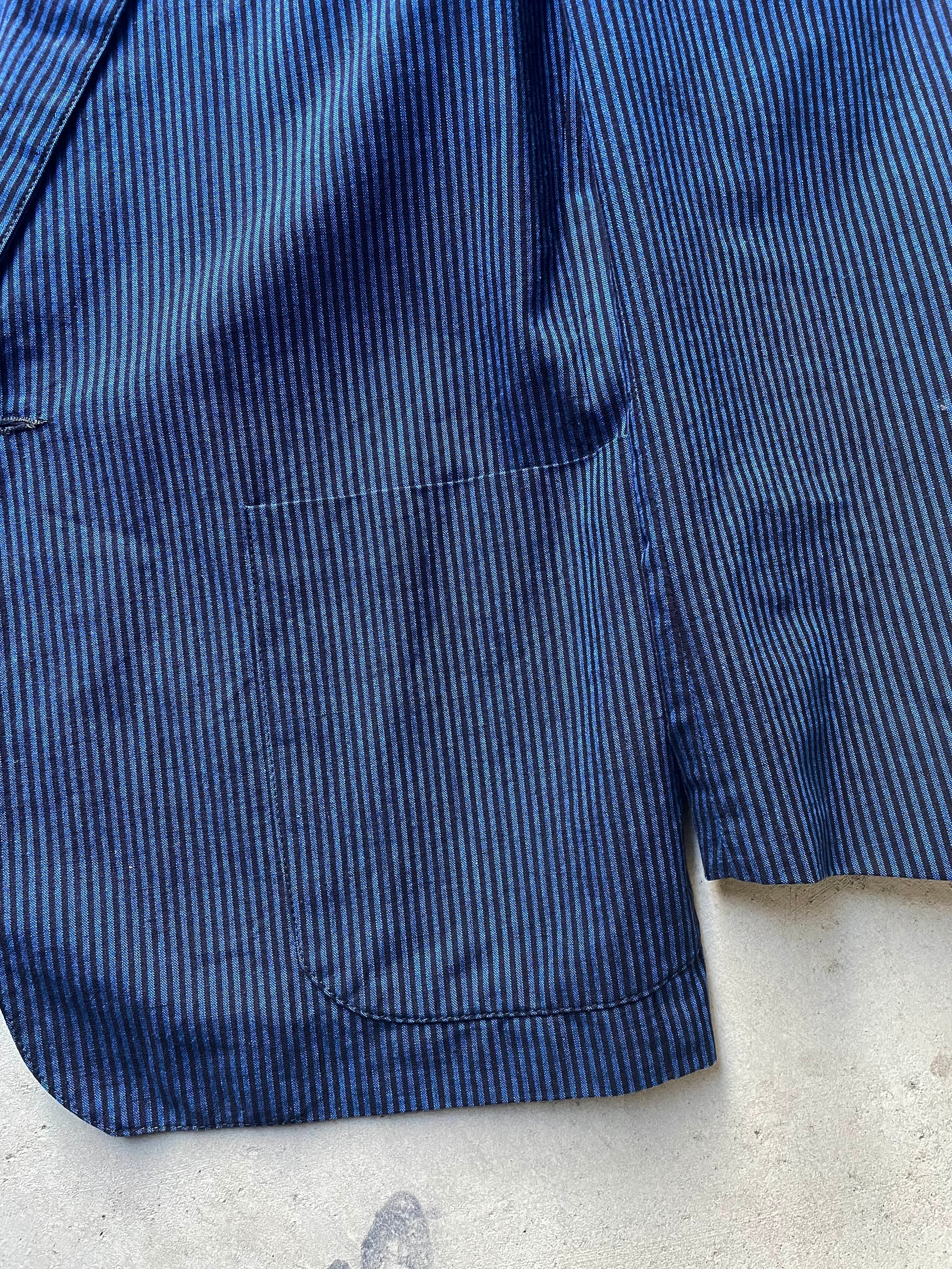 ブルー×ブラックのストライプがクール。コットン素材なのでカバーオールのような雰囲気です。サイズも大きめなので、気兼ねなくガバッと羽織れます!